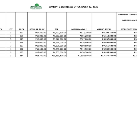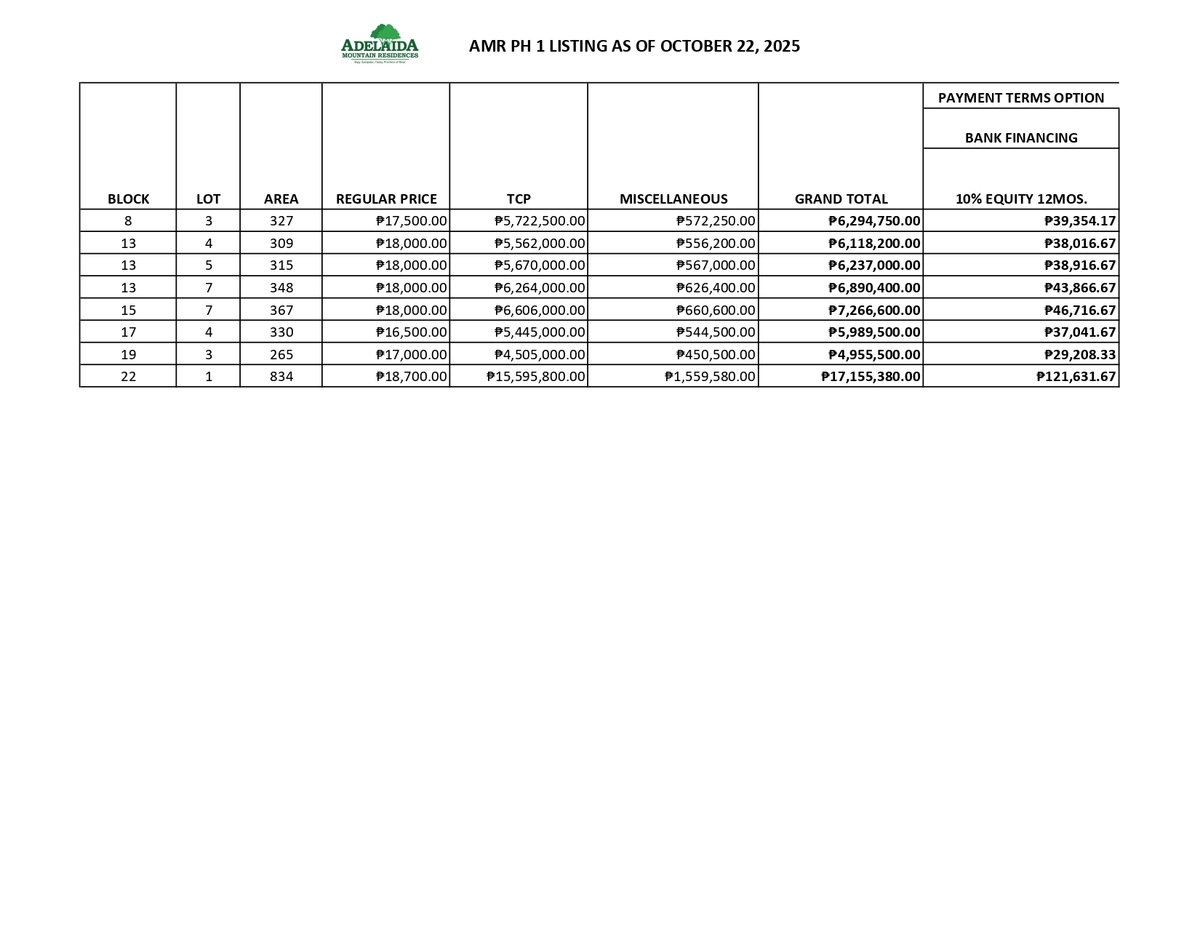 Adelaida Mountain Residences is a premium mountain community offering residential lots only, perfect for building your dream home with breathtaking views, fresh air, and a peaceful environment.